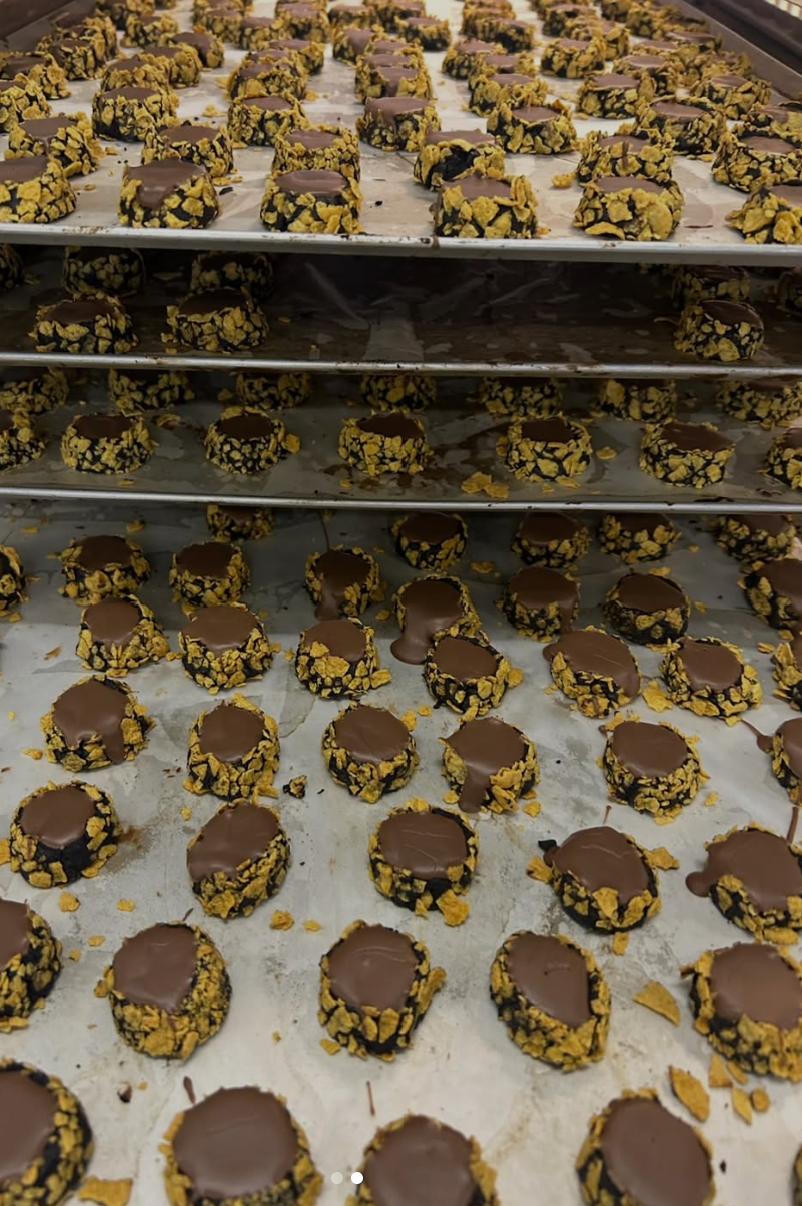 • Biskut coklat rangup yang disaluti cornflakes keemasan yang garing.